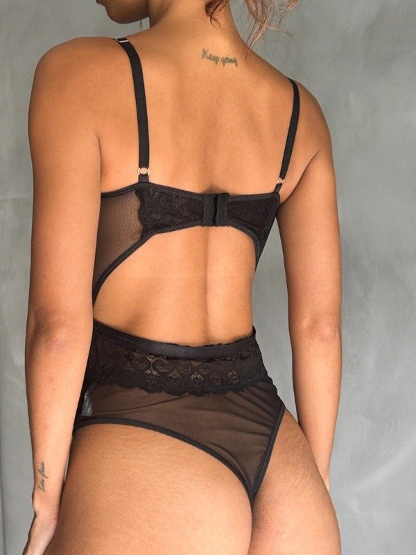 ✅️ Body de puntilla y microtul negro. Lleva aro de copa entera, tiene las tasas forradas color nude para que no transparente y tiene el detalle de las arandelas en el centro. Además lleva gancho de tela en la entrepierna y en la espalda. Los breteles llevan regulador.
